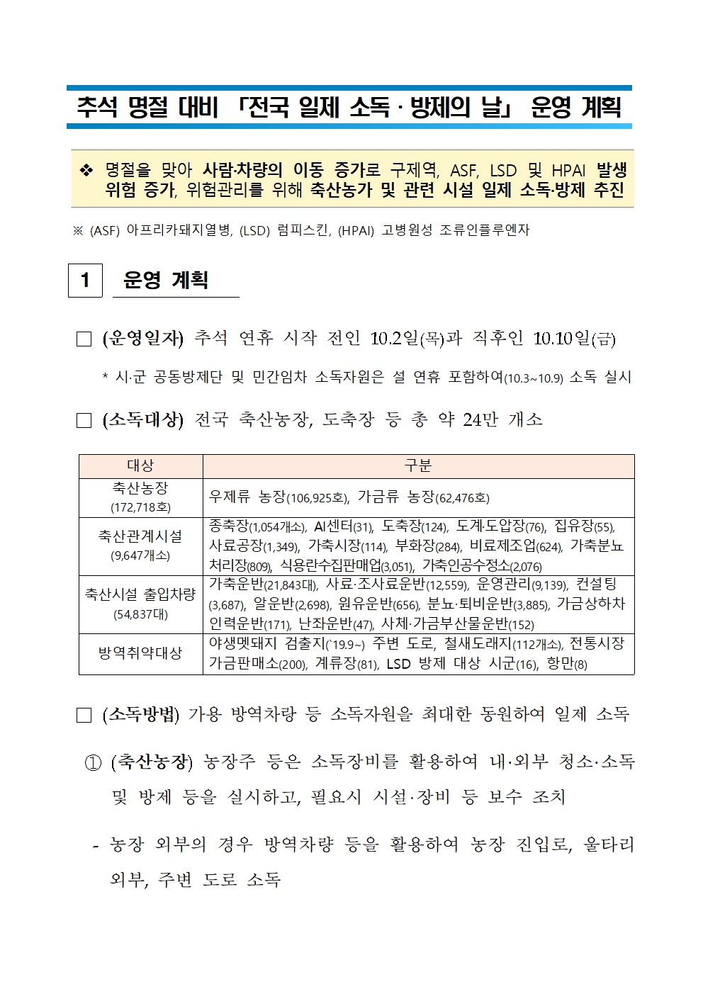추석 명절 연휴(10.3~9일)에 사람과 차량의 이동이 많아질 것으로 예상됨에 따라 가축전염병 발생을 예방하기 위하여「전국 일제 소독·방제의 날(10.2일, 10.10일)」을 운영할 계획입니다. 많은 참여 부탁드립니다.