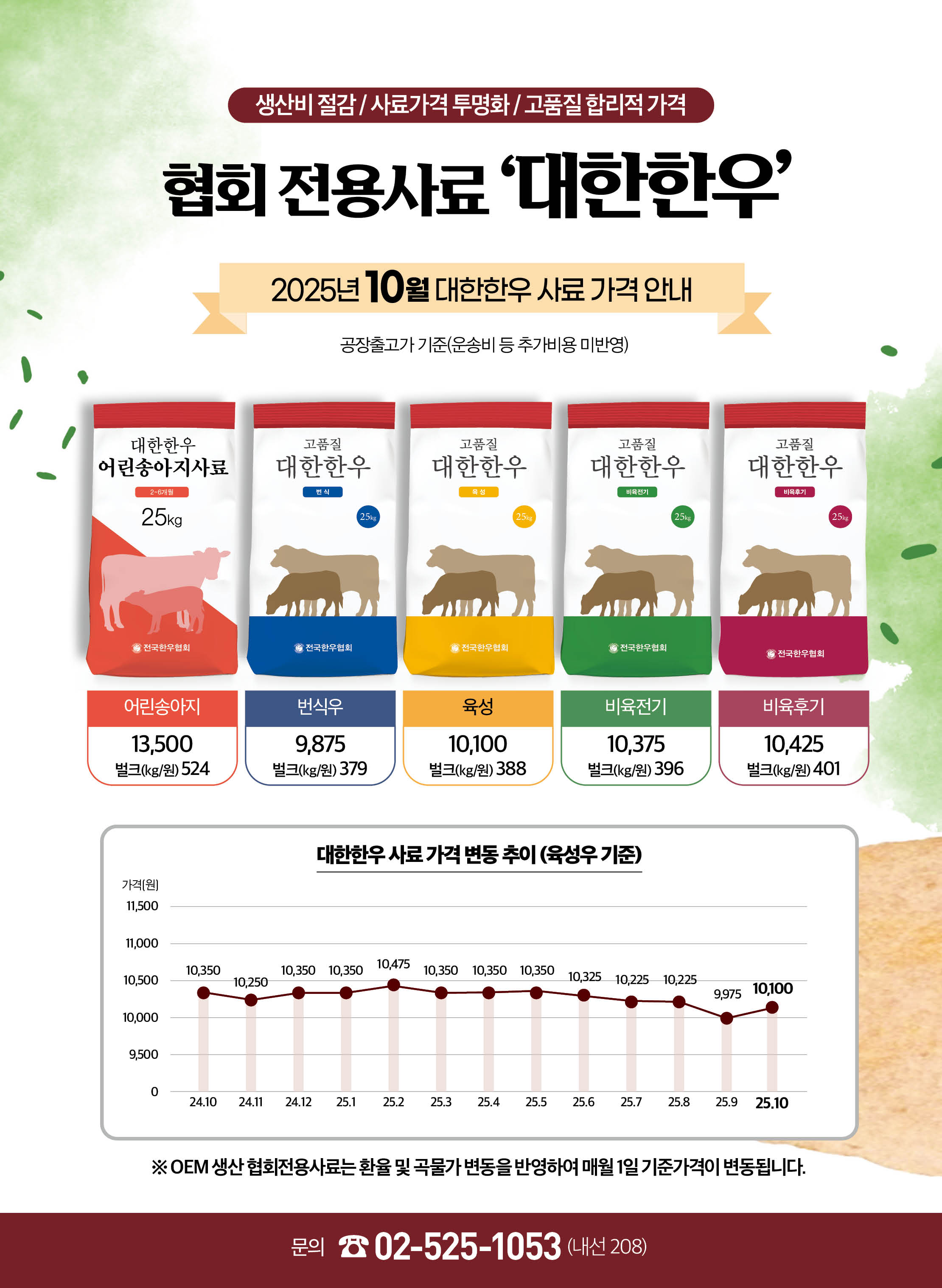협회전용사료 '대한한우' 2025년 10월 가격표