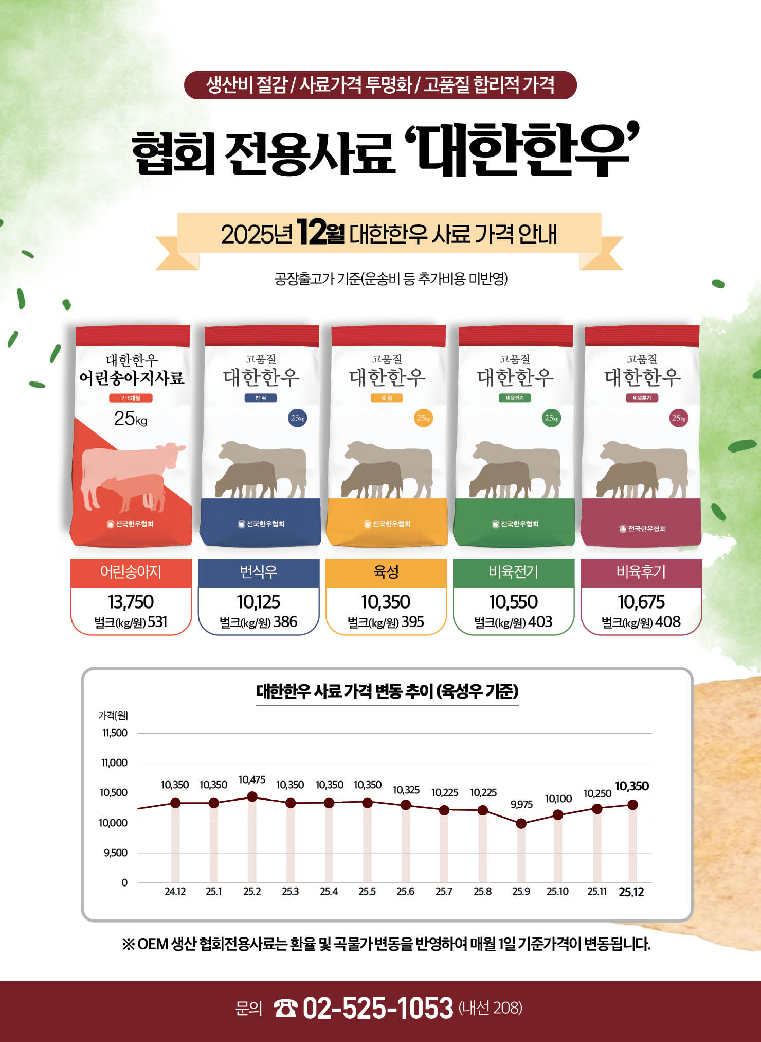 협회전용사료 '대한한우' 2025년 12월 가격표