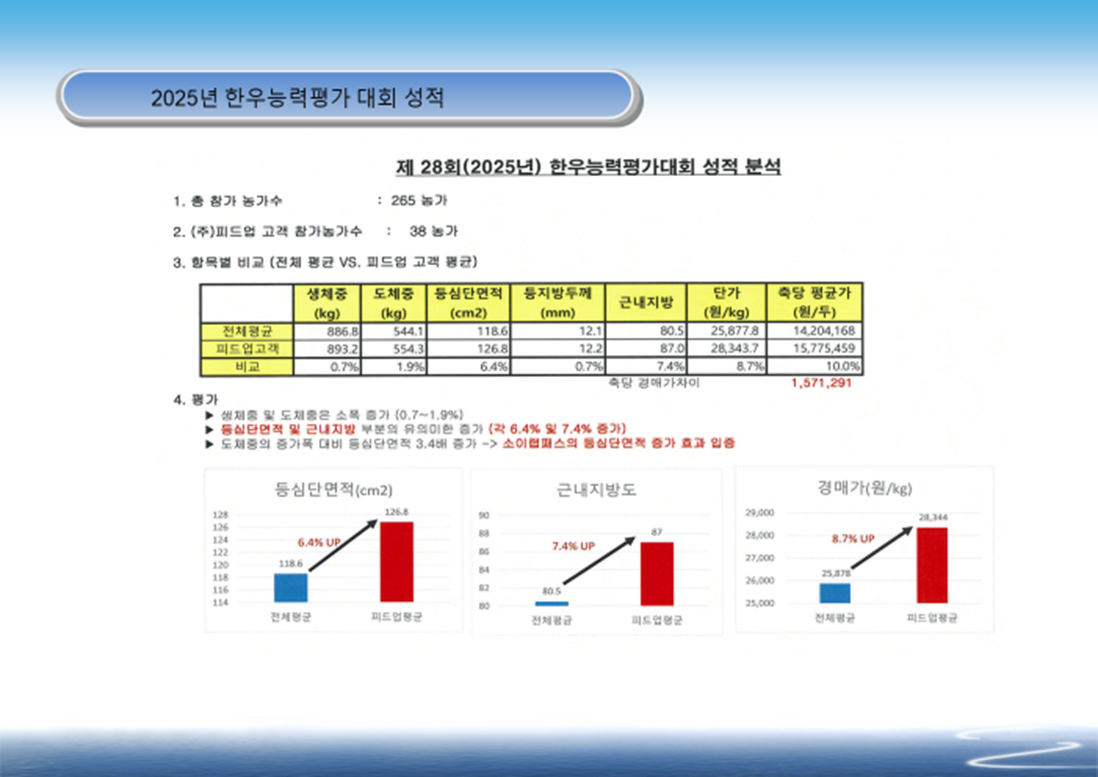 제품소개 (1) 제품명 : 소이랩패스(SoELAB Pass)1) (2) 포장단위 : 20kg 지대, 800kg 톤백 (3) 특징 및 장점 : 국내 유일의 바이패스 발효 대두박 ① 유산균 발효로 대두박 내 설사의 원인인 라피노스(Raffinose) 및 스타 키오스(Starchyose) 같은 난소화성 올리고당의 탁월한 제거 → 바이패스율 80%로 고창증, 요산증 완벽 방지 바이패스(BYPASS)란 ? 대두박내 단백질 아미노기와 환원당(포도당,과당)을 결합시켜 반추위내 단백질 분해효소가 작용하지 못하게 함으로써 반추위내에서 단백질이 분해되지 않고 소장까지 통과시켜, 단백질이 소장내 알칼 리성 pH에서 단백질 변성작용에 의해 단백질 분해효소가 분해하여 소 장내에서 아미노산이 흡수되도록 함 → 단백질의 효율적 흡수 활용 및 반추위 내 암모니아 생성이 줄어 들어 암모니아 농도가 낮아져 요산증, 고창증, 과산증 및 입닫음병을 예방함. ② 베타 콘글라이시닌(ß-Conglycinin)같은 알러지 유발 물질분해를 통해 장내 상피세포 발달 촉진 ③ 전자동 생산관리 시스템에 의한 생산공정 차별화로 일관된 품질 유지 와 외부 오염 방지 ④ 발효산물로서 유산균, 젖산, enterocin(유해 세균의 성장을 억제하는 펩타이 드) 및 GABA 함유 로 장내 면역기능 강화 ⑤ 젖소, 비육우, 염소, 양 등 반추위 동물의 바이패스 단백질 원료 → 총 단백질 흡수율 52%로 일반 대두박(12%)의 4배 이상 ⑥ 소이랩패스는 단백질과 아미노산의 이용효율을 증가시켜 분변 내 질소를 감 소시켜 환경 비용을 절감하고 탄소중립에 기여(탄소발생량 40% 감소) ◉ 경제성 분석 조건 – 송아지 생후 이후 도축시(26개월)까지 소이랩패스 추가 급여시 (소이랩패스 가격 ₩1,600/kg) 생 후 ~ 8개월 총 20kg (이유 후부터 하루 100~200g) 9개월 ~ 18개월 총 75kg (하루 200~300g) 19개월 ~ 26개월 총 85kg (하루 300~400g) 총 180 kg (20kg지대 총 9포) 예상 결과 ■ 비용 측면 소이랩패스 급여시 총 ₩288,000 추가 비용이 발생하지만 출하월령 5개월 단축으로 이 기간 총 사료비용 (하루 10kg, ₩6,000 예상 ₩900,000을 절감하여 생산비 측면에서 ₩612,000을 절감 ■ 수입 측면 소이랩패스 급여시 육량 증가 및 육질 개선으로 출하단가(₩1,330/kg) 인상으로