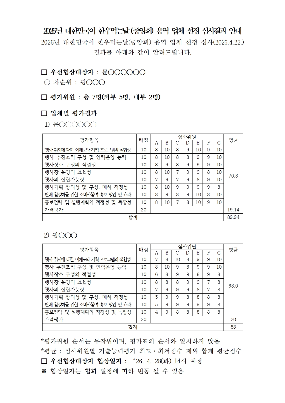 2026년 대한민국이 한우먹는날(중앙회) 용역 업체 선정 심사결과 안내